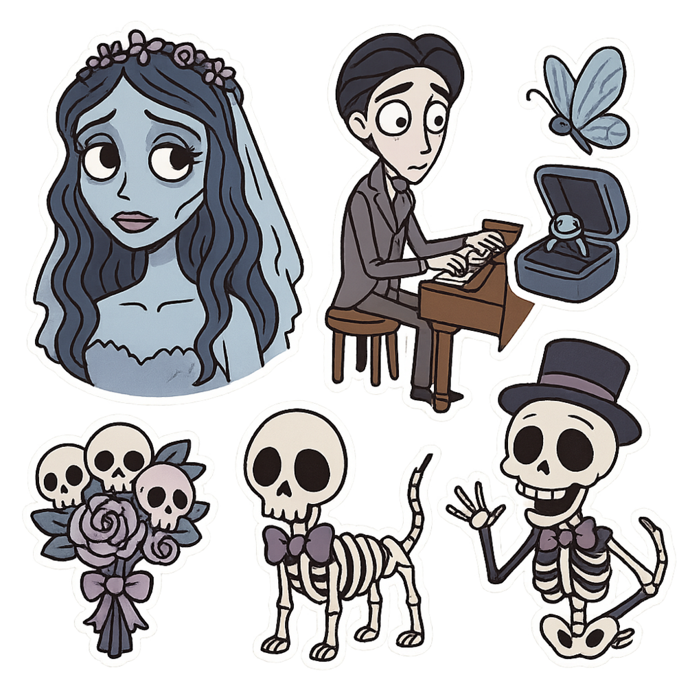 Corpse Bride Gothic Sticker Pack – 6 Transparent PNGs